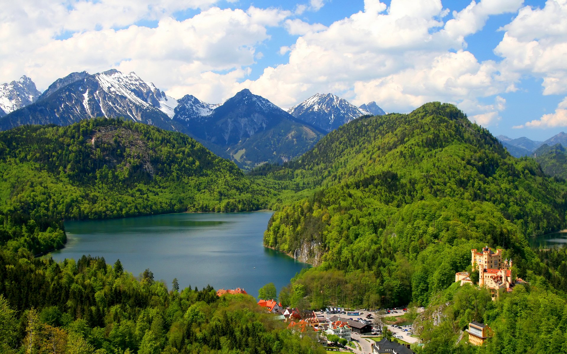 Castillo con torres, cubierto de musgo, contra el cielo azulCastillo con torres, cubierto de musgo, contra el cielo azul