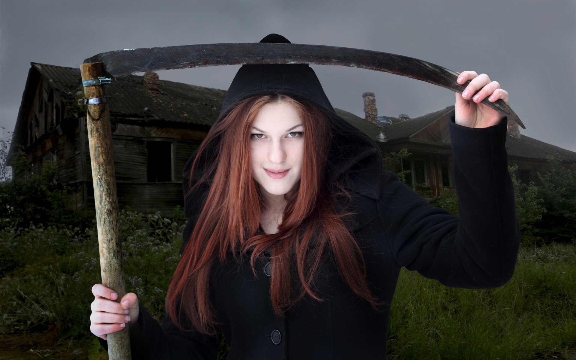 Chica con una guadaña en el fondo de un edificio abandonadoChica con una guadaña en el fondo de un edificio abandonado