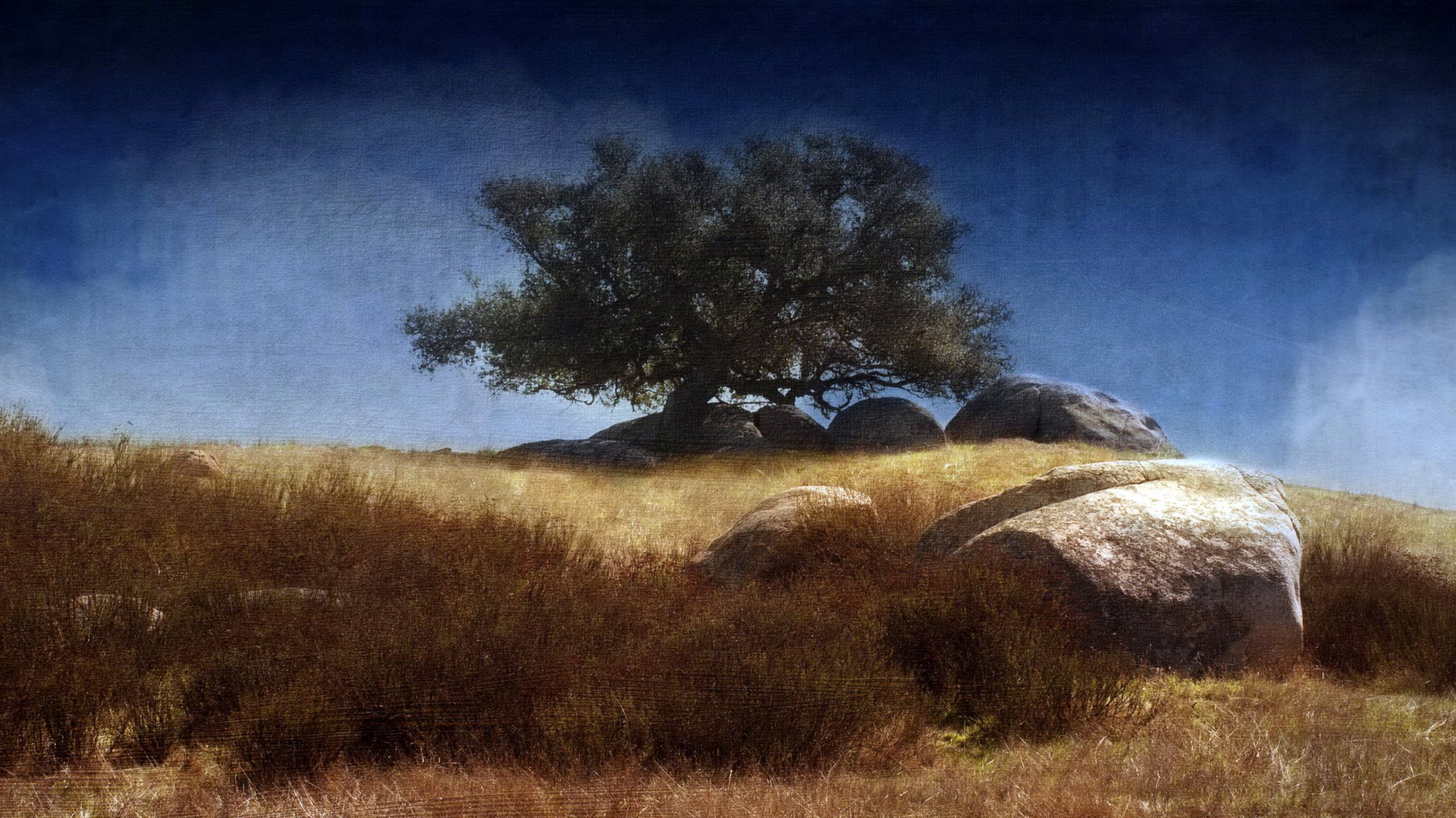 Un gato gris se esconde detrás de un árbol con hojas verdesUn gato gris se esconde detrás de un árbol con hojas verdes