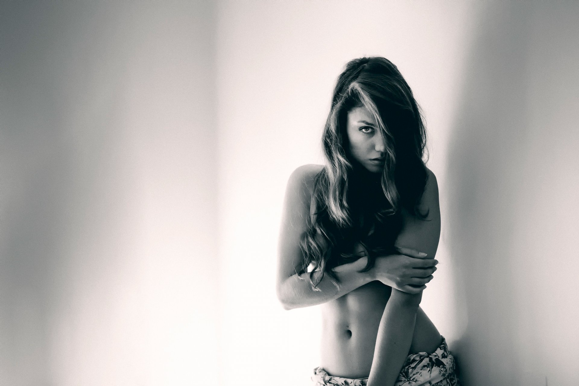 Sexy morena con labios hinchados y en lencería sexy yace en una cama arrugadaSexy morena con labios hinchados y en lencería sexy yace en una cama arrugada