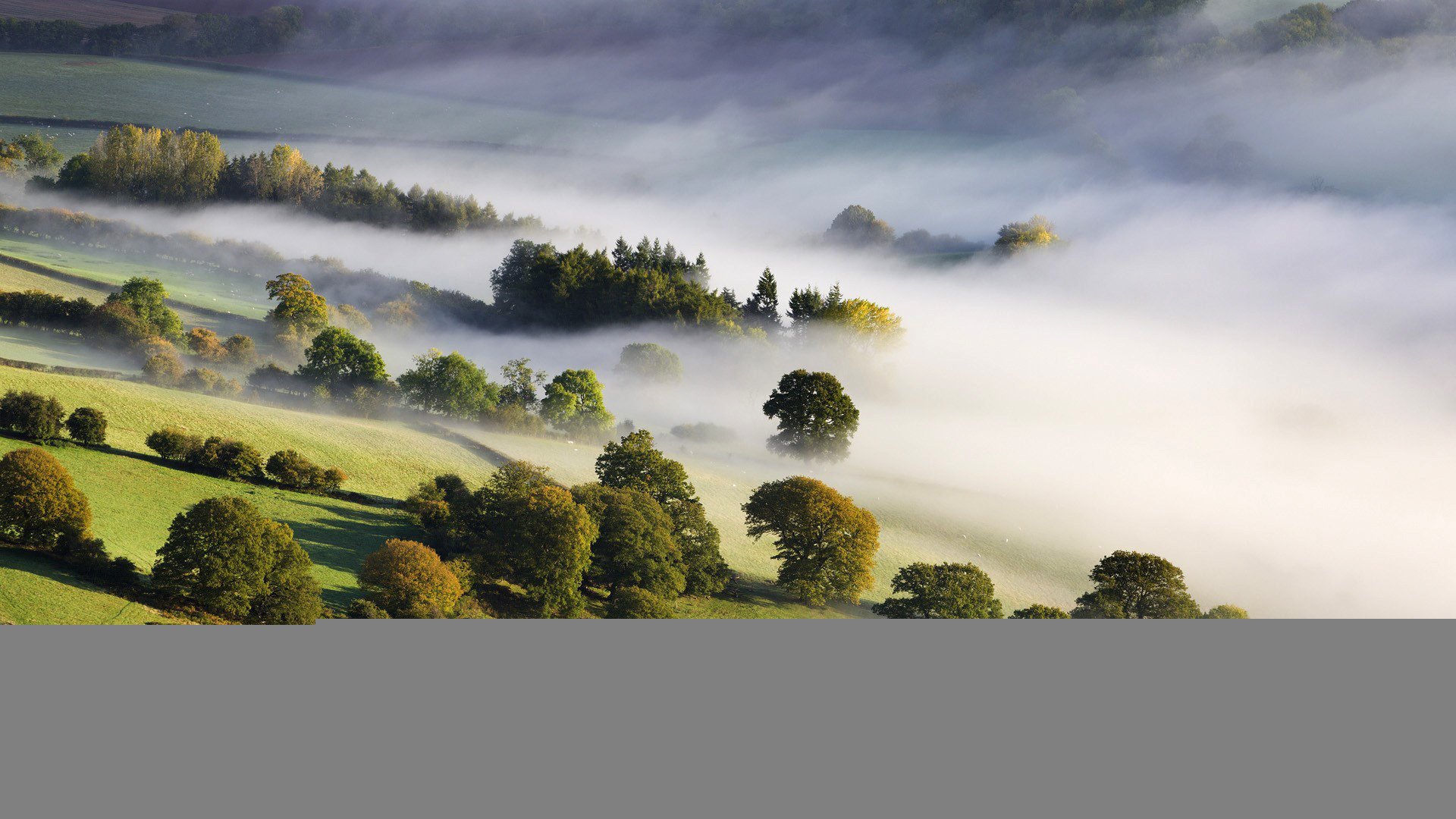 Un valle de belleza mágica con increíbles tonos de rocas y un bosque multicolor en primer plano con un cielo azul y rojoUn valle de belleza mágica con increíbles tonos de rocas y un bosque multicolor en primer plano con un cielo azul y rojo