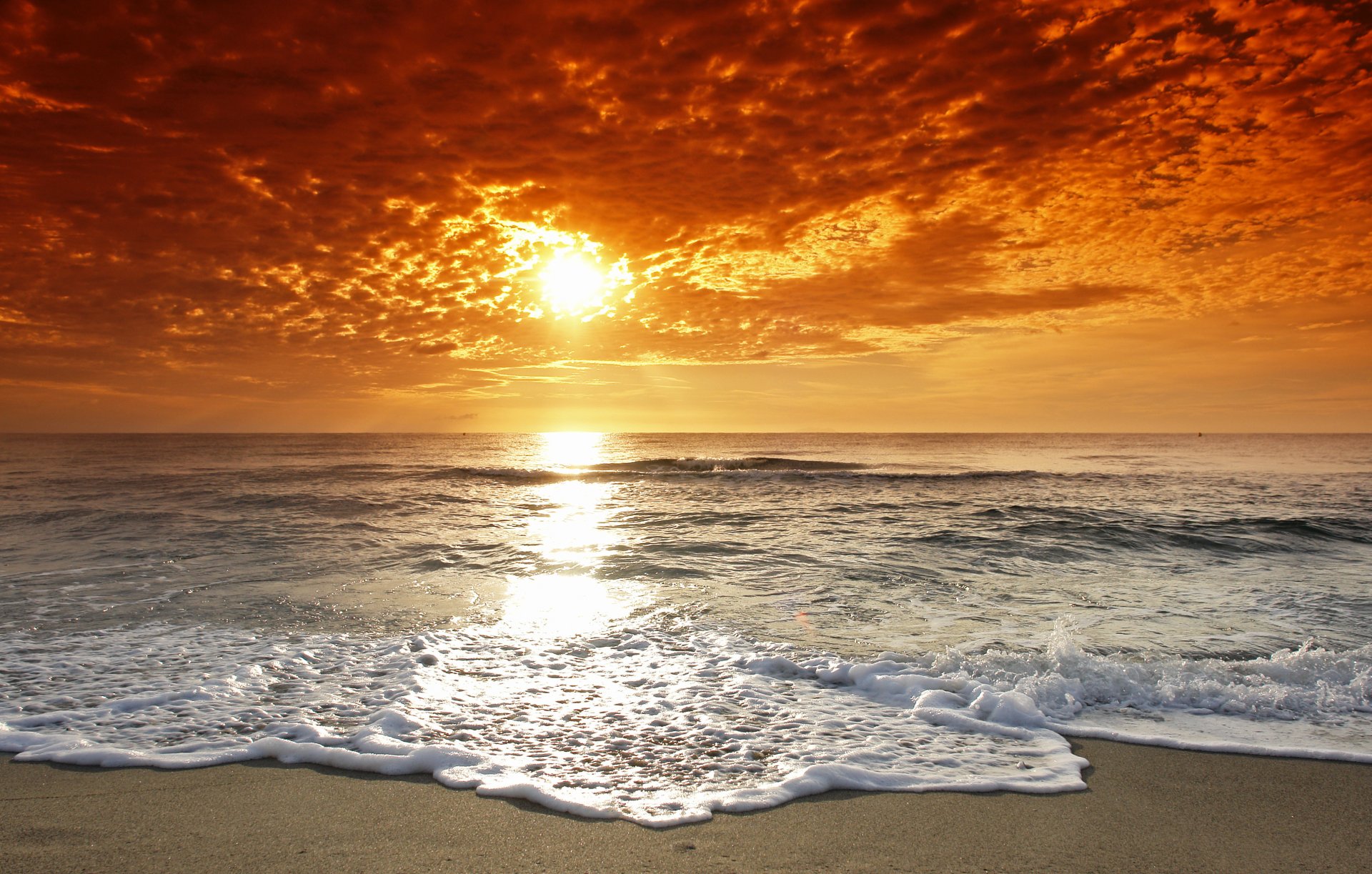 Puesta de sol en la playa. Nubes sobre el océano vespertino