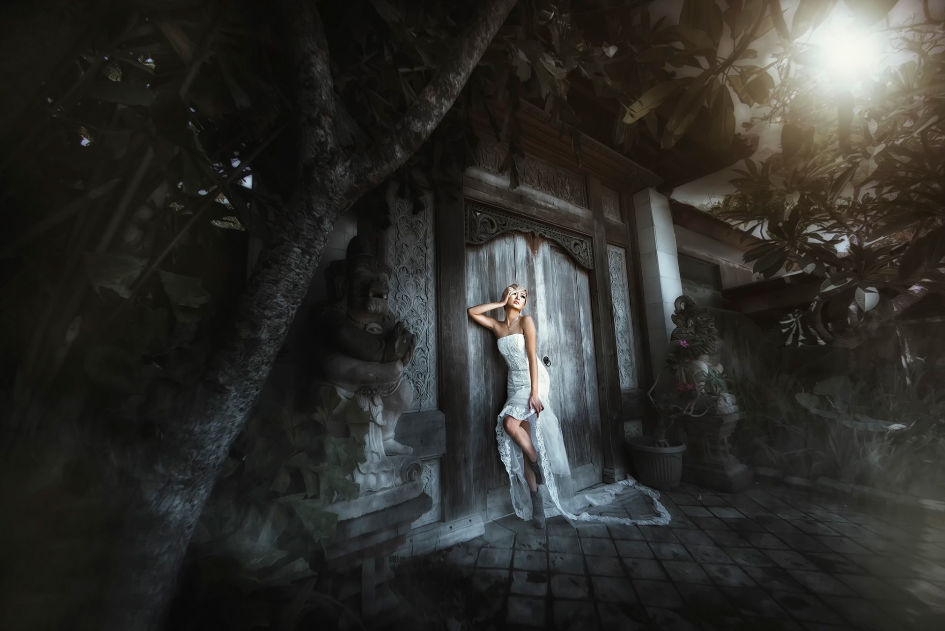 Una niña con un vestido de krpsiv yace sobre una cama de pielUna niña con un vestido de krpsiv yace sobre una cama de piel