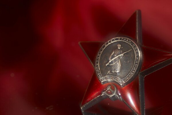 Medalla estrella roja para la fiesta del 9 de mayo sobre un fondo rojo