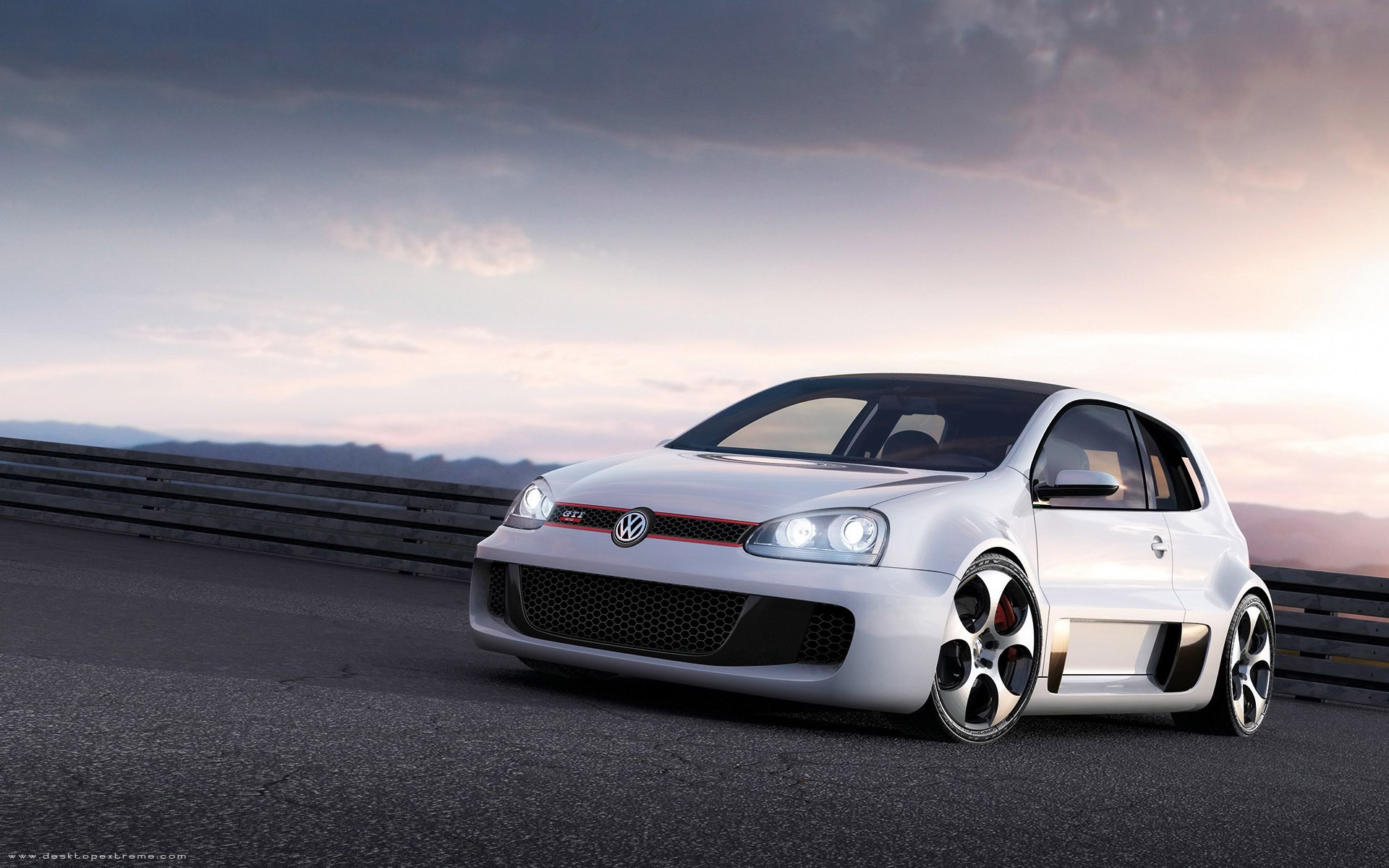 Volkswagen blanco en el fondo de la puesta de sol