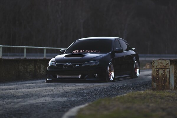 Hermoso coche detrás de la valla de hierro en el estacionamiento