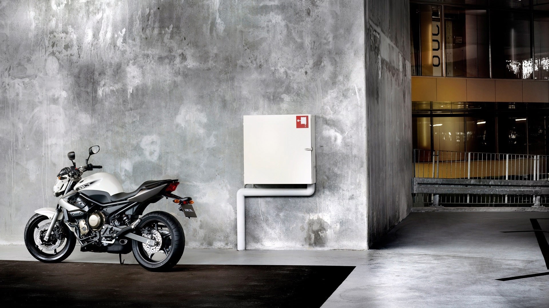 Moto deportiva de carreras yumaha en el estacionamientoMoto deportiva de carreras yumaha en el estacionamiento