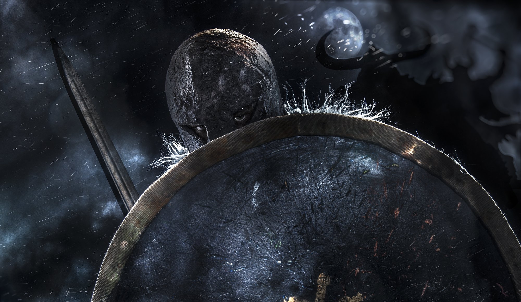 Secutor, gladiador en armadura con costura y espada, fondo negroSecutor, gladiador en armadura con costura y espada, fondo negro