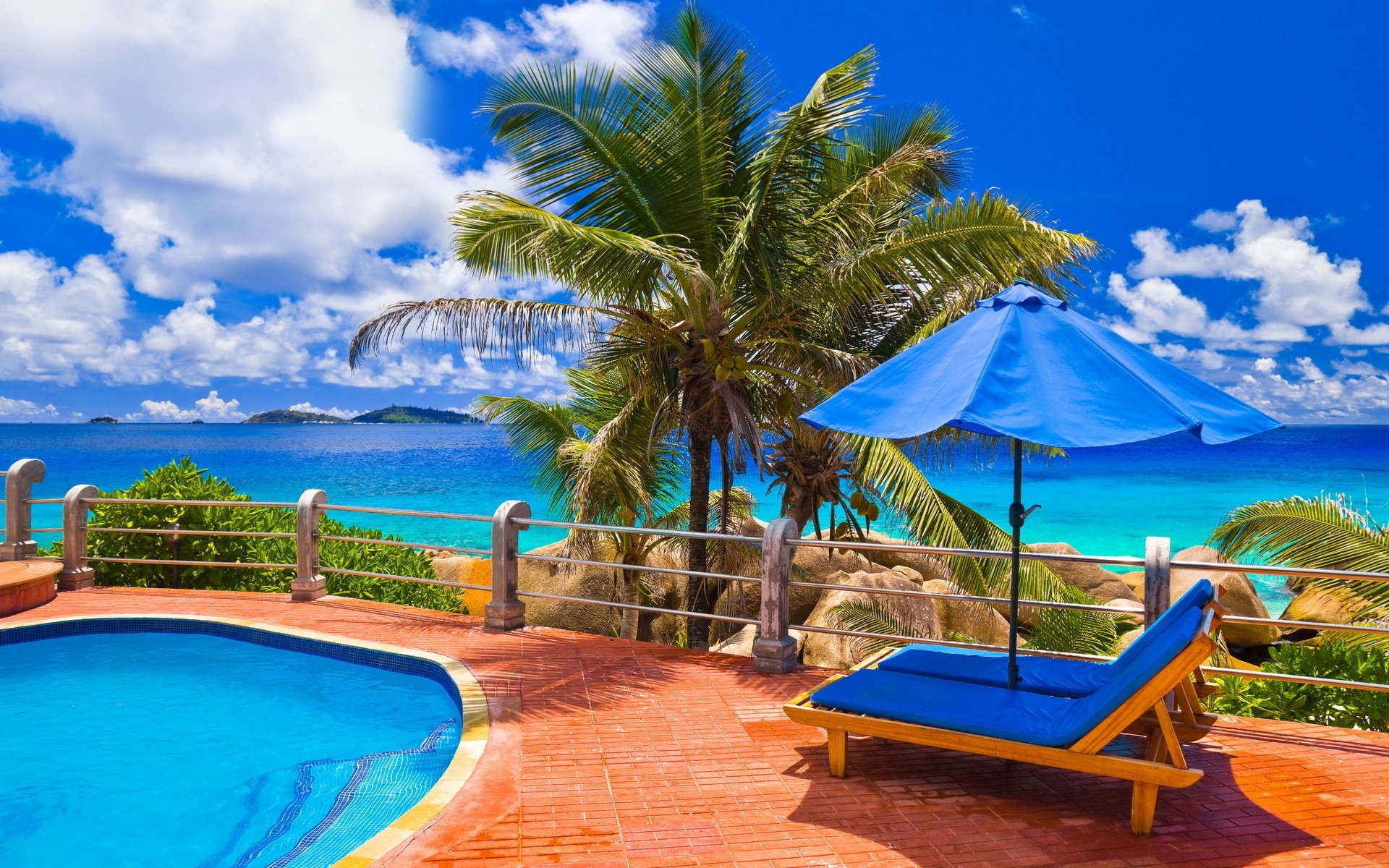 Etiquetas:mar, piscina, palmeras, nubes, cielo azul, agua azul, tumbonas, ocio, paraguas, piedras, valla, agua, cielo